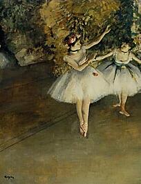 印象派を代表する大画家エドガー・ドガ随一の傑作『舞台の2人の踊り子』。本作は画家が数多く手がけたバレエの踊り子(バレリーナ)を画題とした作品の中の一点で、本場面が本番公演の最中を描いたものであるか、練習風景の場面であるかは定かではないものの、ドガの卓越した個性的な絵画表現が随所に示されている点は大いに注目すべきものである。