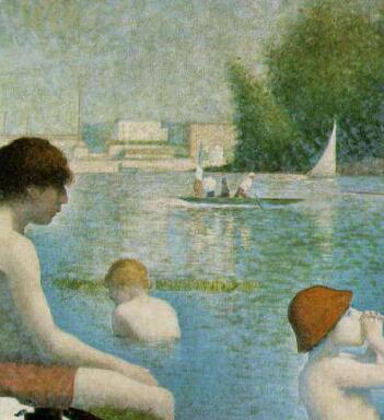 明確な輪郭による堅牢で記念碑的な人物描写。本作に描かれるのは、本作はパリ北西、セーヌ河沿いにあるアニエールの風景(画面右部分には画家随一の代表作の舞台『グランド・ジャット島』も見える)と、そこで水浴や日光浴などをおこない余暇を楽しむ人々である。