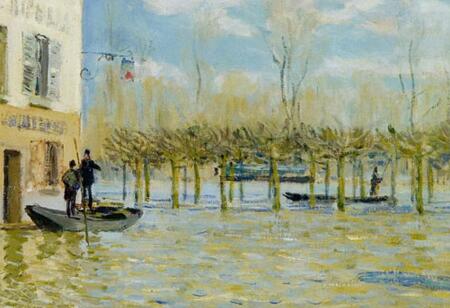 清涼感と開放感に溢れた空の表現。画面の約三分の二の面積を使用される広々とした空の清涼感に溢れる鮮やかな色彩と空間的な開放感には、この洪水によって一変してしまったセーヌ川やポール=マルリの姿、そしてそこで生活する様々な人々の日常とは対照的に、何事においても犯されることのないある種の普遍性を感じさせる。